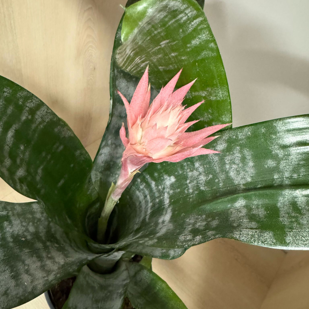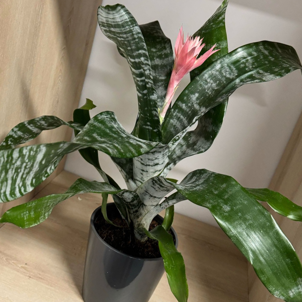 Name: Aechmea Fasciata, also known as the "Silver Sparrow" Origin: Aechmea Fasciata is native to the tropical regions of Southeast Brazil. Did you know that?: Aechmea Fasciata is part of the bromeliad family and is popularly called the "vase plant", due to its leaves that form a cone from which the magnificent inflorescence rises. The height of the plant, including the pot, is 60-65 cm, and the diameter of the pot is 15 cm. The plant is sold with flowers, and its inflorescence can last up to 6 months.