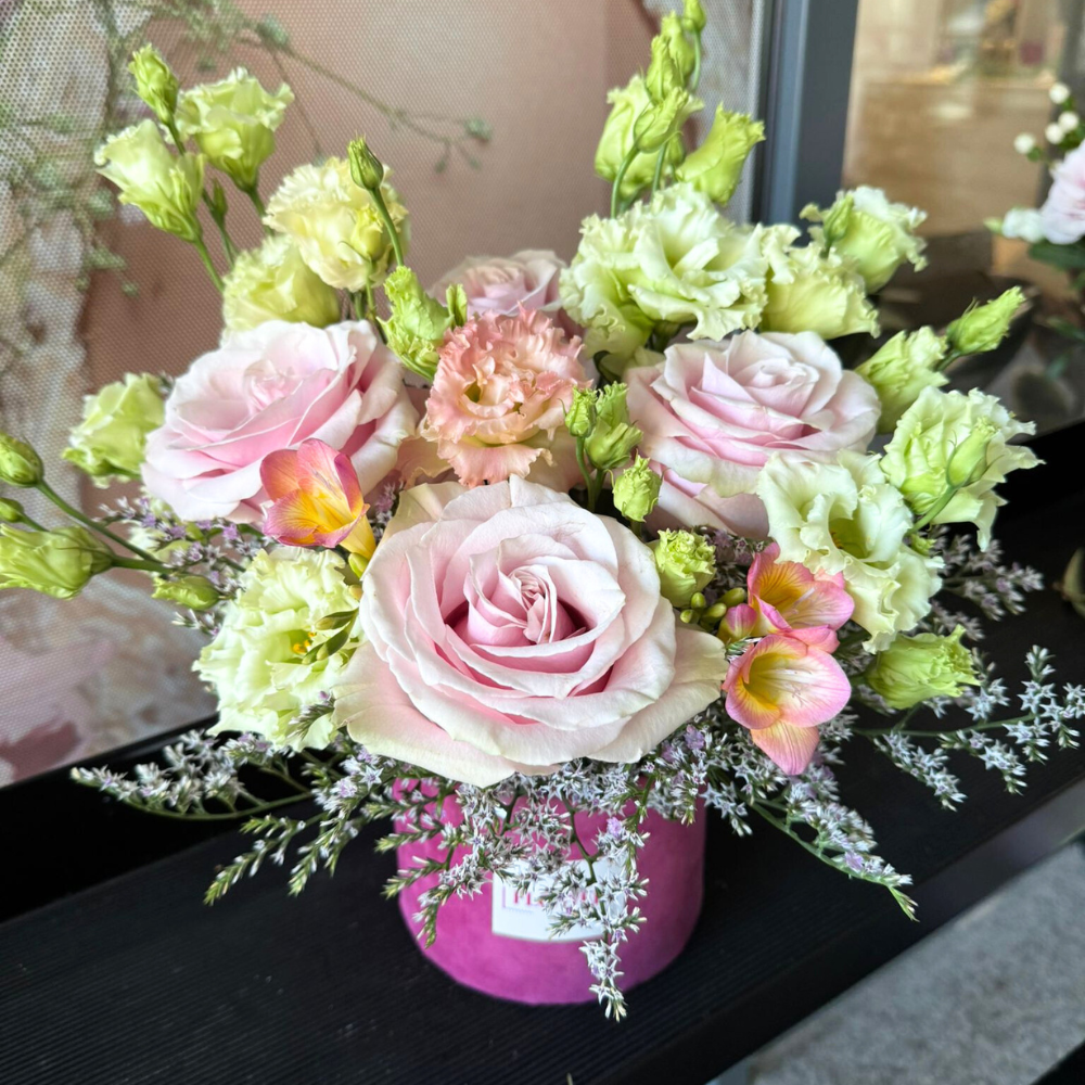 Floral composition : roses, lisianthus, limonium, freesia. This may vary depending on availability.