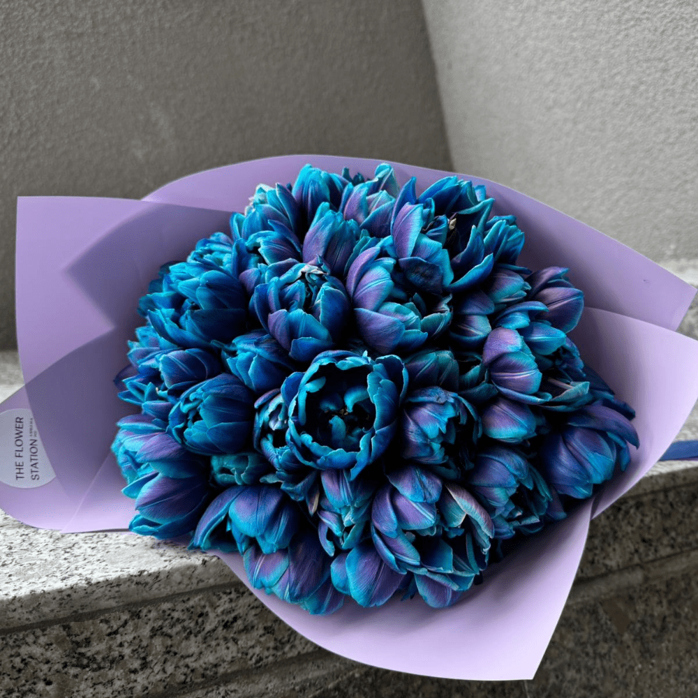 A special bouquet of 47 blue tulips. These “giant” blue tulips are a wonderful choice when you want to impress a tulip lover. The best part is that they are available from November until late spring.