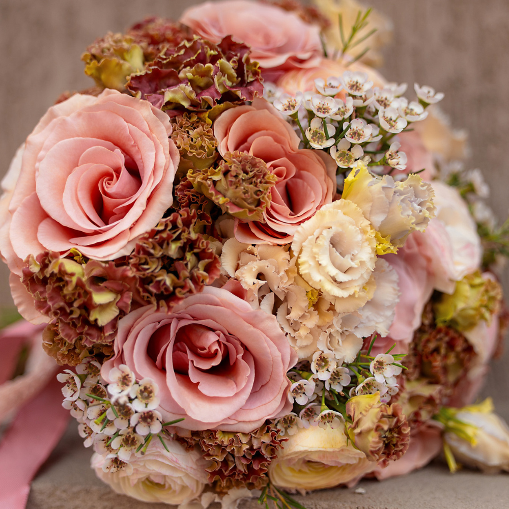 Each flower is carefully chosen to provide a refined and sophisticated look, perfect to complement the beauty and elegance of the bride on her big day. Among the flowers that make up this bouquet we list: roses, lisianthus, ranunculus, waxflower.