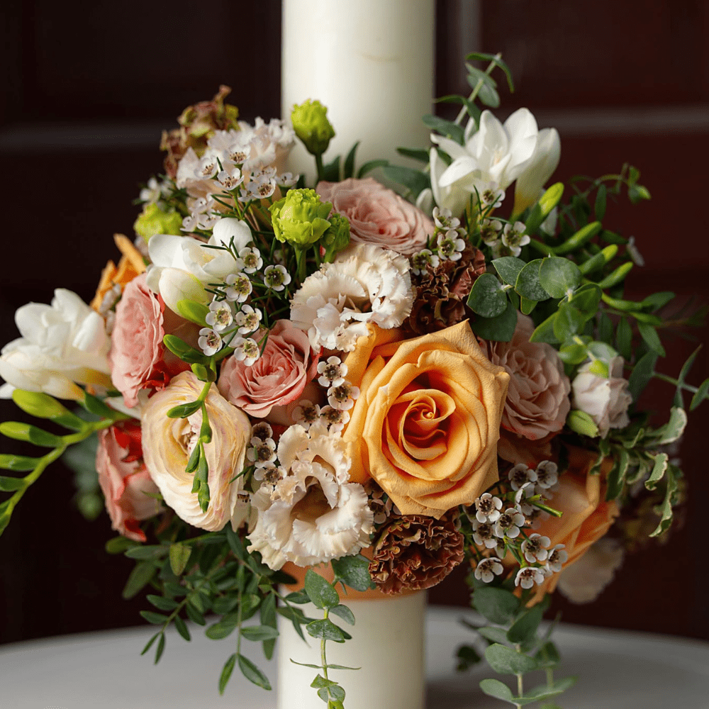 What makes this girl baptism candle made of natural flowers truly special is the elegant and harmonious floral arrangement. Decorated with flowers in warm shades and accents of orange, the candle brings an extra touch of grace and refinement to any baptism ceremony.