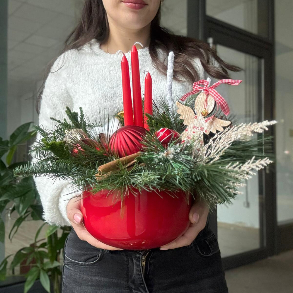 Aranjamentul de Crăciun „Christmas Spirit” aduce în casă magia iernii prin prospețimea ramurilor de brad și pin, puse în valoare de cele trei lumânări roșii care creează o lumină caldă și primitoare. Decorurile atent alese și vasul de ceramică roșu completează perfect atmosfera festivă, transformând aranjamentul într-o piesă centrală plină de farmec și tradiție.