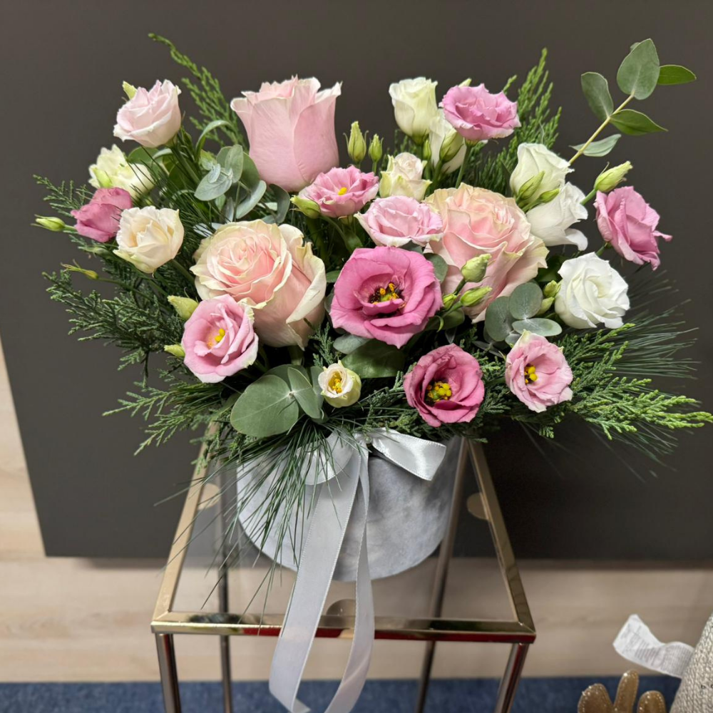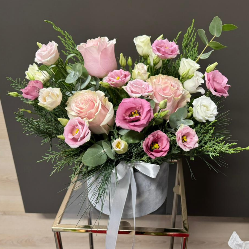 Compoziție florală: trandafiri, lisianthus si verdeata decorativa. Aceasta poate varia în funcție de disponibilitate.