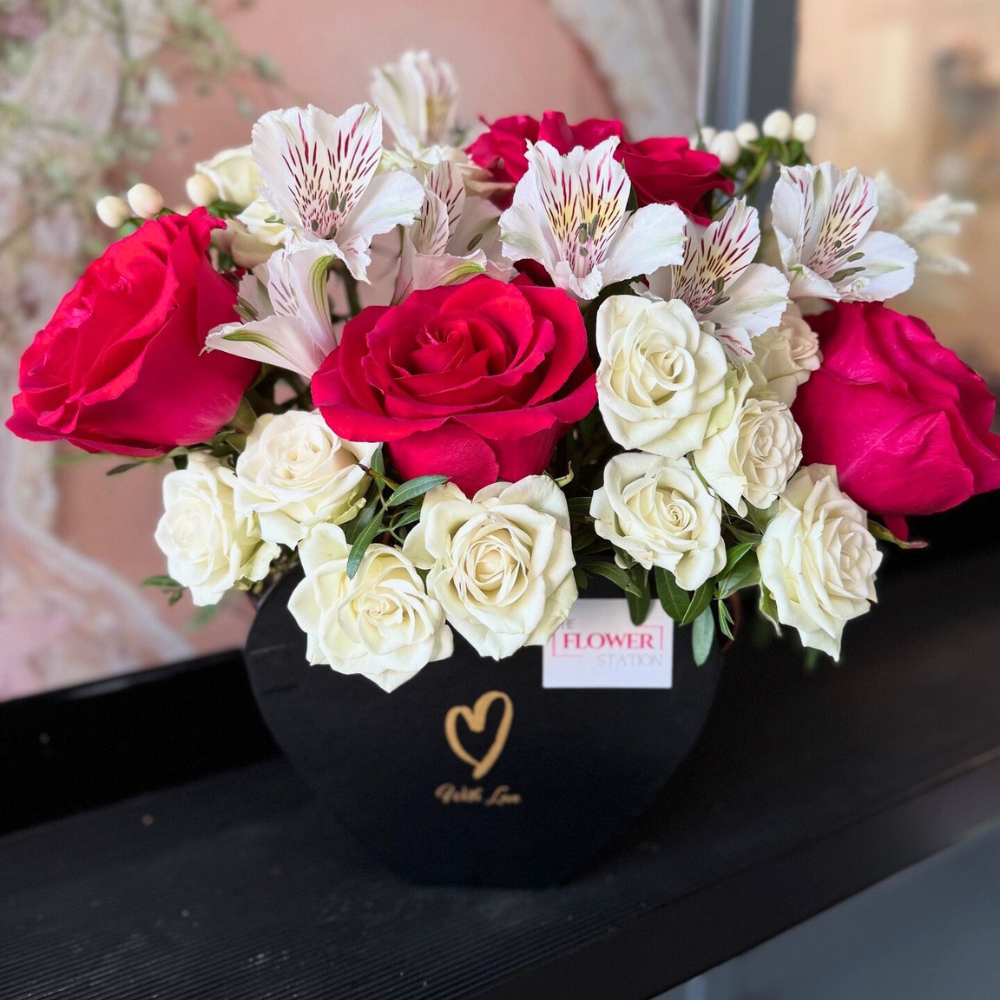 Compoziție florală: trandafiri, alstroemeria, minirosa. Aceasta poate varia în funcție de disponibilitate.