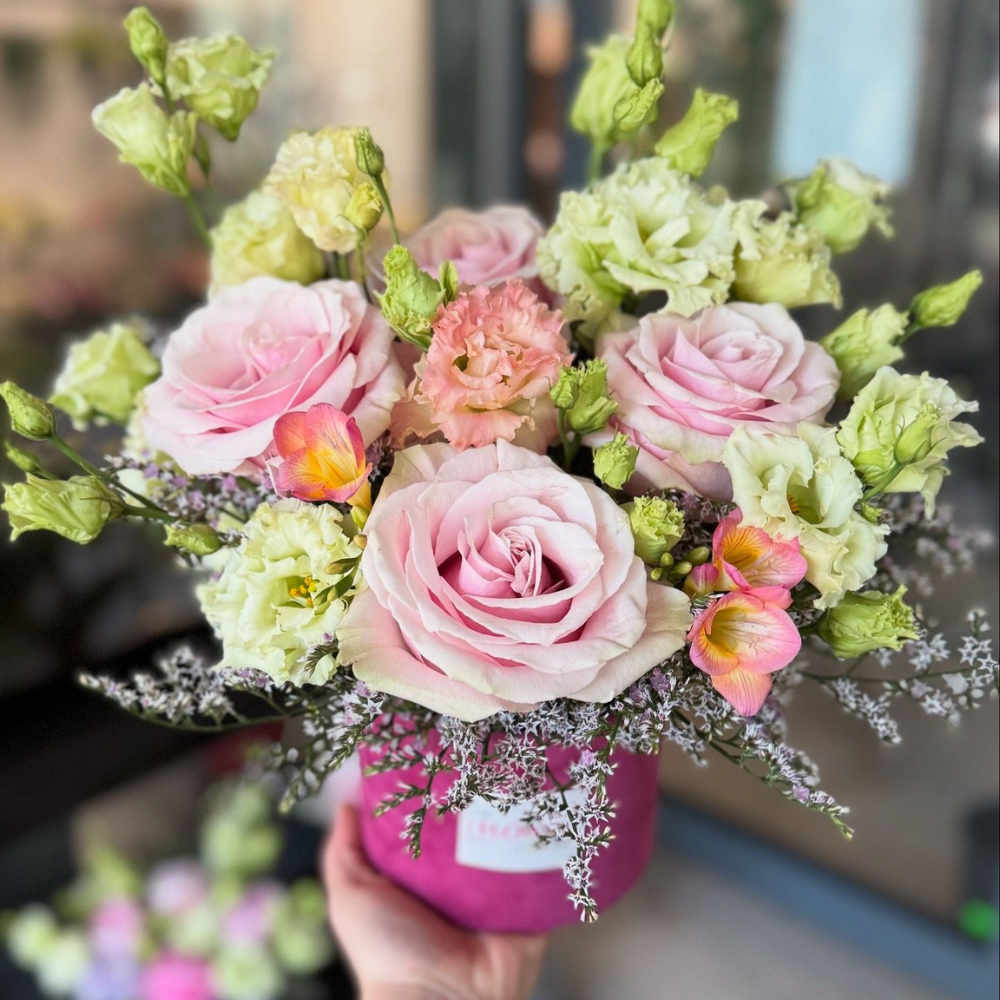 Compoziție florală: trandafiri, lisianthus, limonium, frezii. Aceasta poate varia în funcție de disponibilitate.