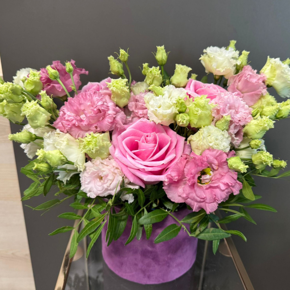 Compoziție florală: trandafiri, lisianthus, verdeata. Aceasta si culoarea cutiei de catifea pot varia în funcție de disponibilitate.