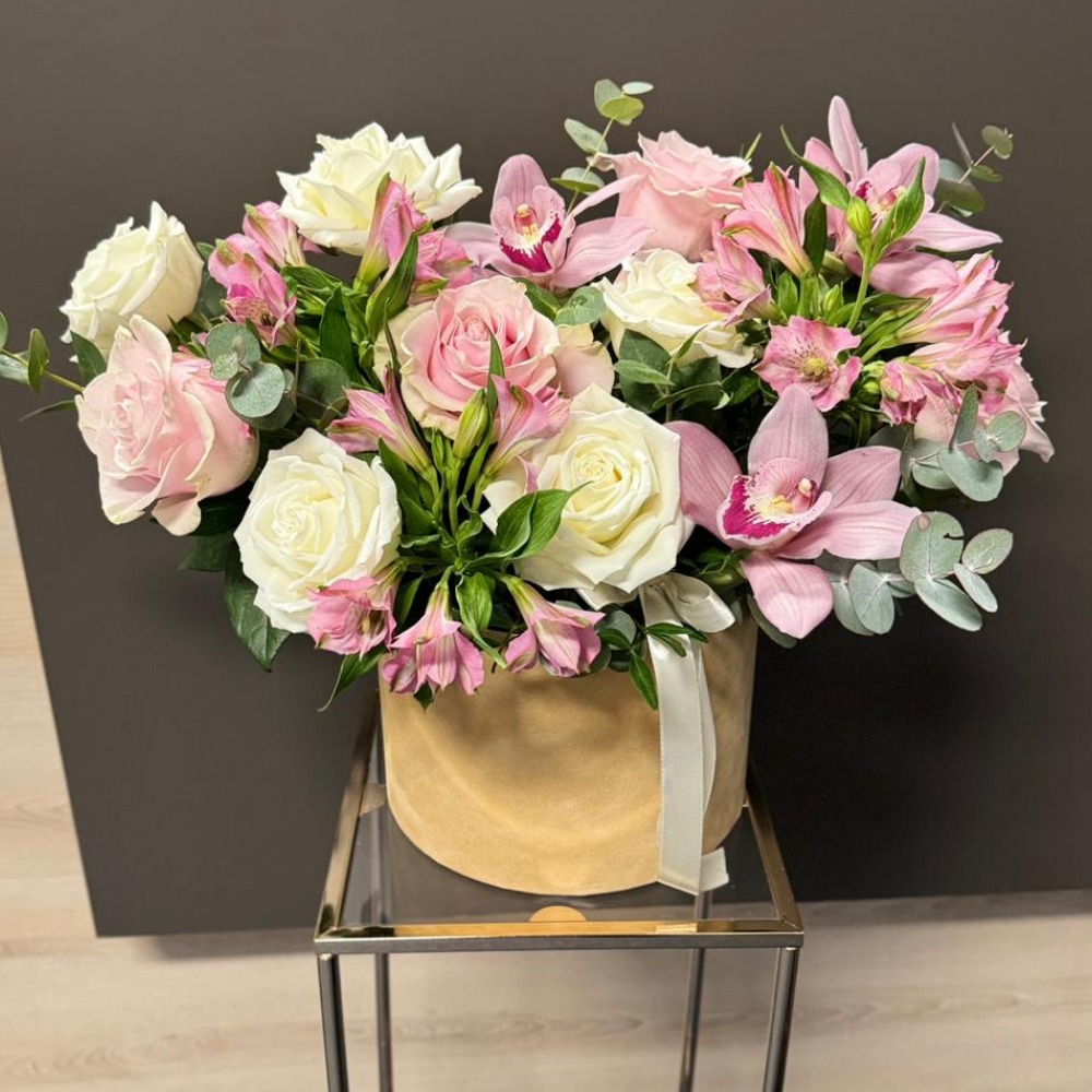 Compoziție florală: trandafiri, alstromeria, orhidee cymbidium. Aceasta poate varia în funcție de disponibilitate.