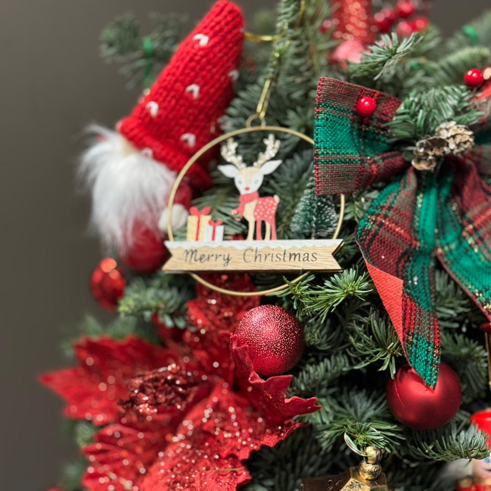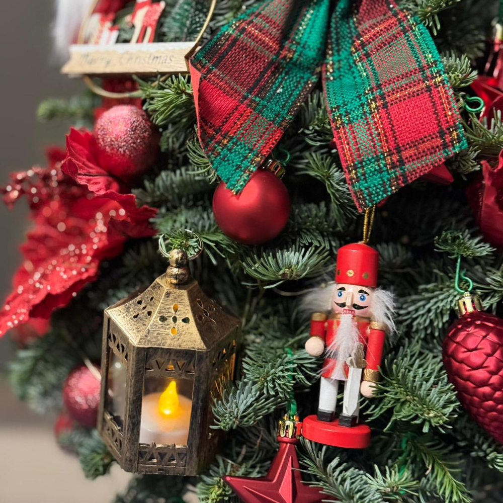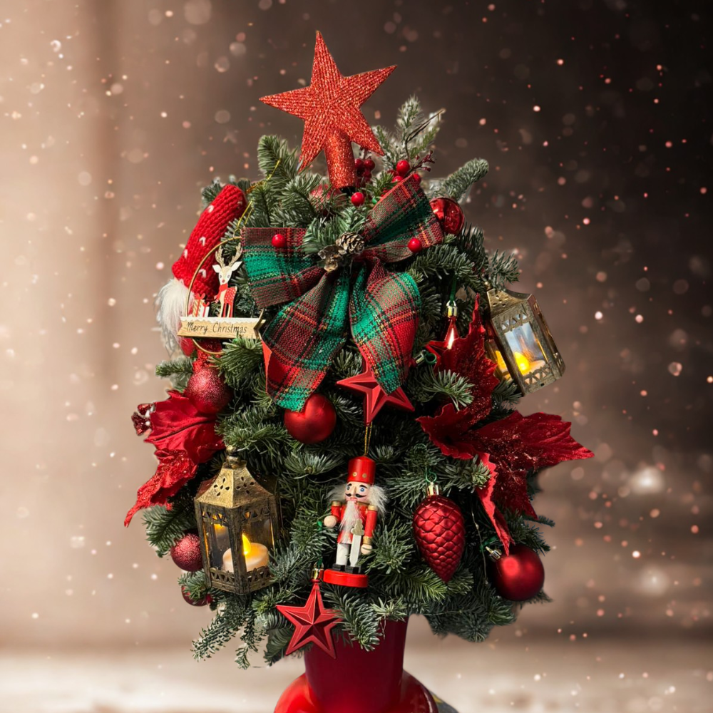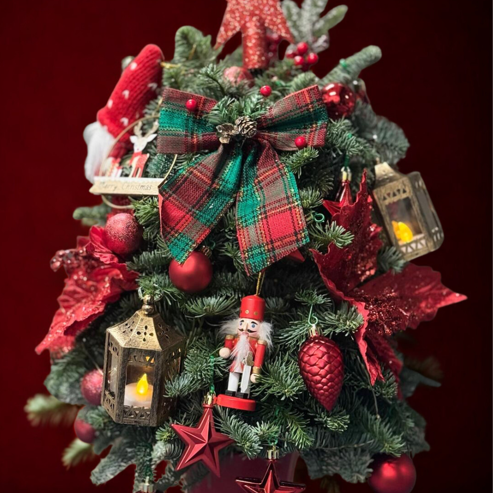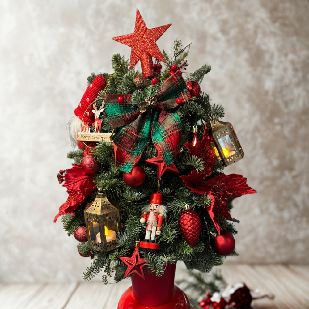 Brad festiv „Red Glam” este un aranjament creat manual în vas de ceramică, fiecare crenguță fiind atent fixată în burete umed pentru a-i păstra prospețimea și forma perfectă. Decorat exclusiv cu elemente roșii – globuri strălucitoare, felinare delicate, gnom jucăuș și funda elegantă – acest brad aduce un aer festiv și sofisticat casei tale. Ideal pentru a înfrumuseța masa de Crăciun, colțurile locuinței sau ca un cadou special, „Red Glam” îmbină măiestria artizanală cu spiritul magic al sărbătorilor.