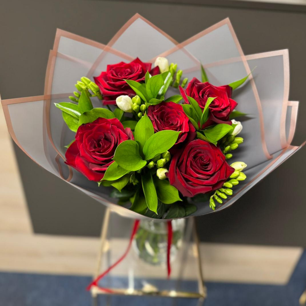 Compozitie florala: trandafiri, frezii, ruscus. In functie de disponibilitate aceasta poate varia.