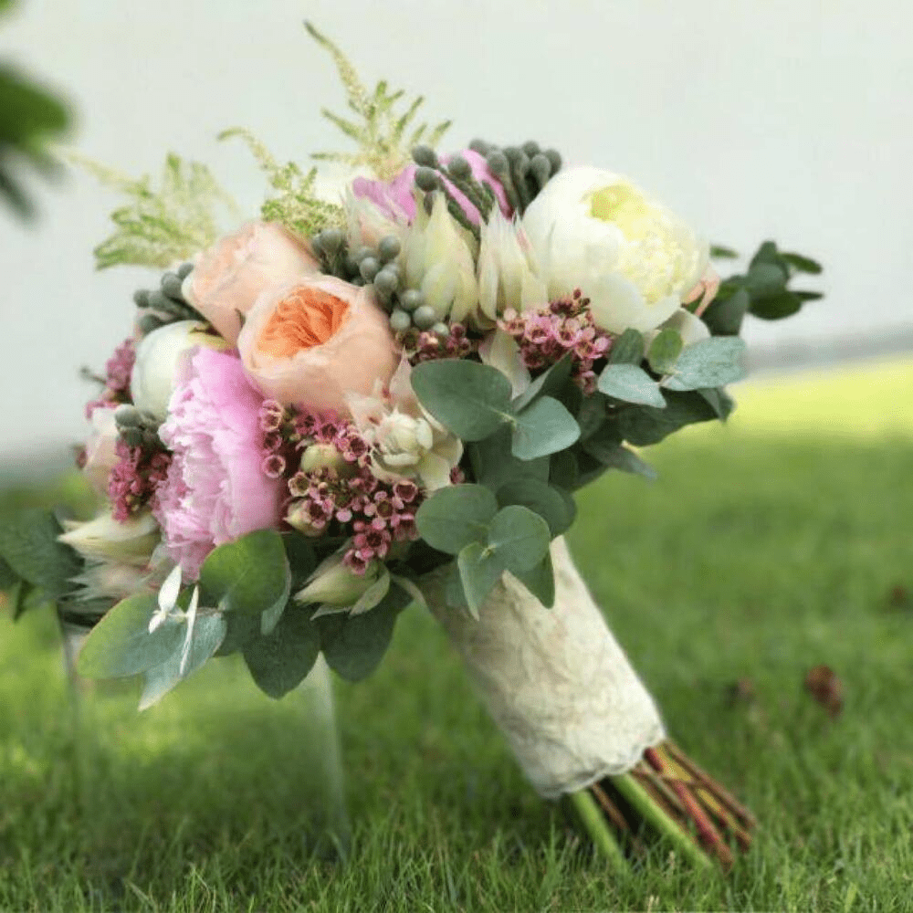Acest buchet este compus dintr-o selecție deosebită de trandafiri de grădina, bujori, astilbe, wax flower și eucalipt. Acesta se încadrează la o dimensiune medie spre mare.