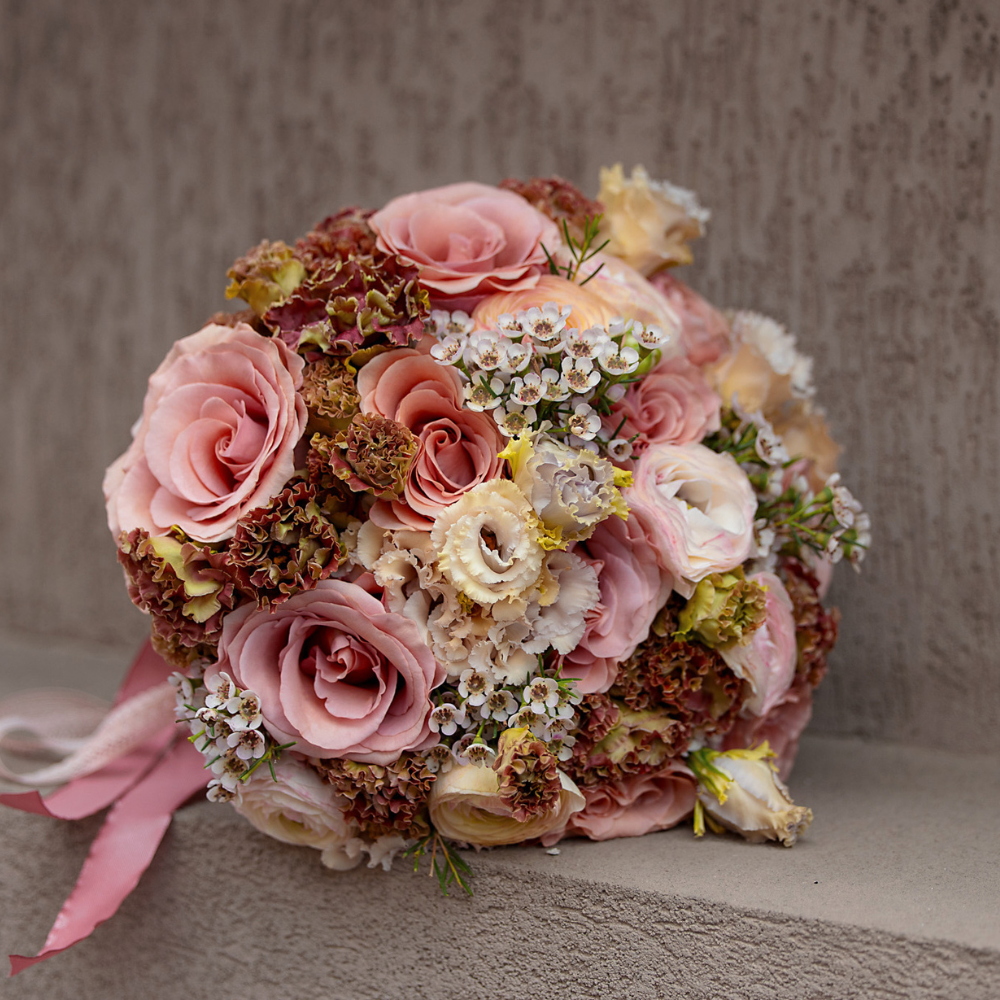 Fiecare floare este aleasă cu grijă pentru a oferi un aspect rafinat și sofisticat, perfect pentru a completa frumusețea și eleganța miresei în ziua cea mare. Printre florile care compun acest buchet enumerăm: trandafiri, lisianthus, ranunculus, waxflower.