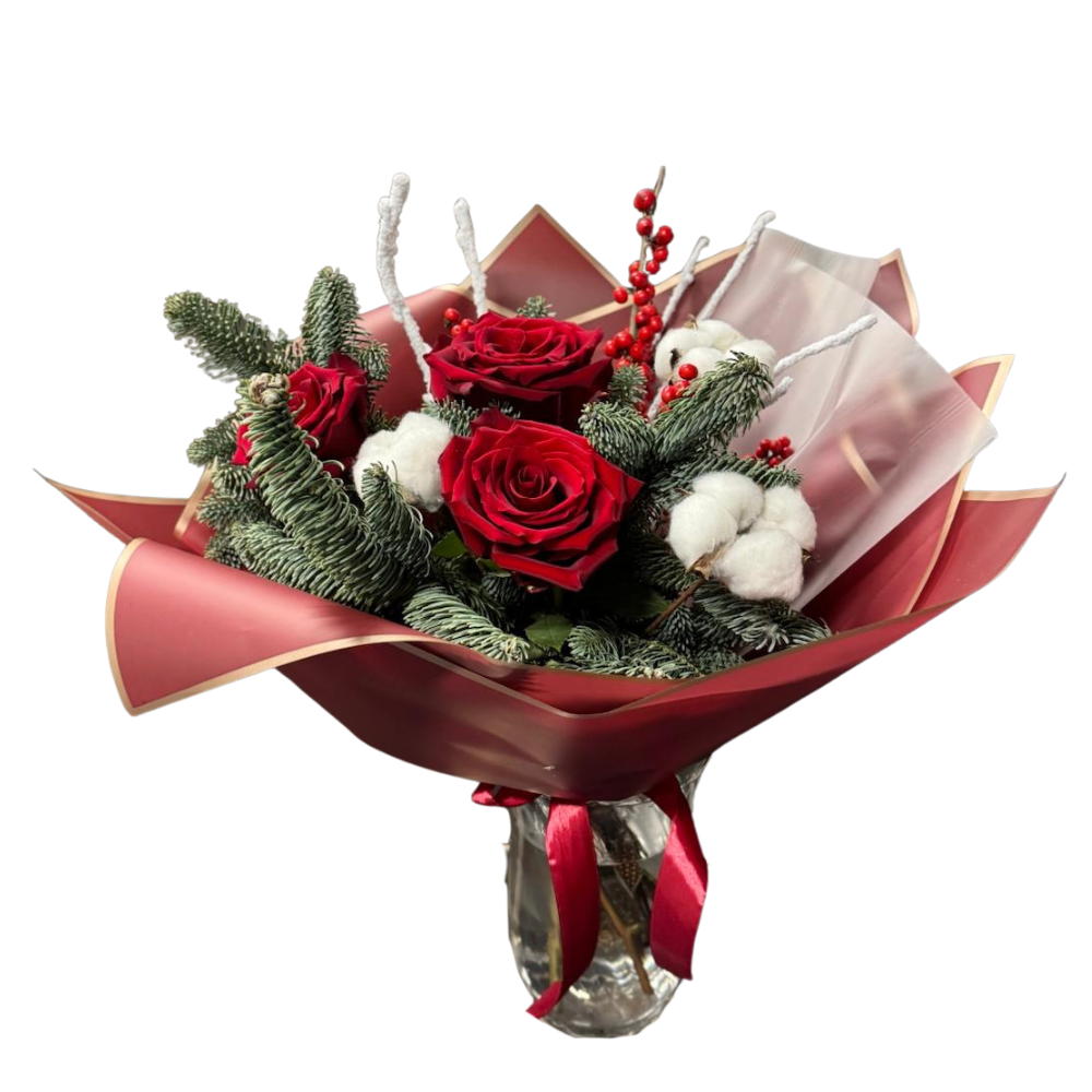 Buchetul „Noel” îmbină armonios bradul proaspăt cu trandafiri eleganți, bumbac delicat și ilex vibrant, creând un aranjament festiv plin de căldură, culoare și spirit de Crăciun.