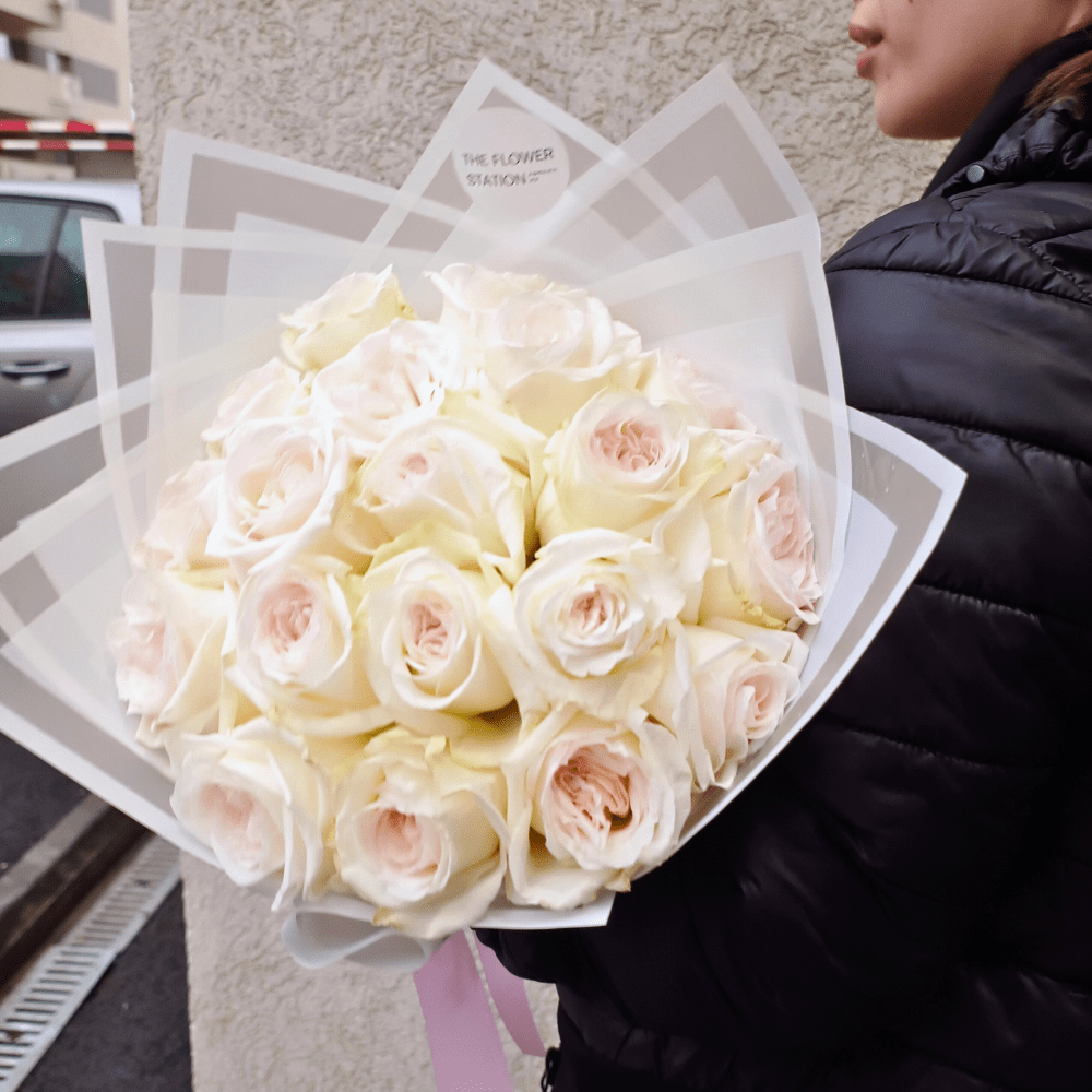 Un buchet special cu 19 trandafiri de grădină albi. Acești trandafiri se remarcă prin parfumul intens, culoarea aparte, dar și dimensiunea florii și a tijei.