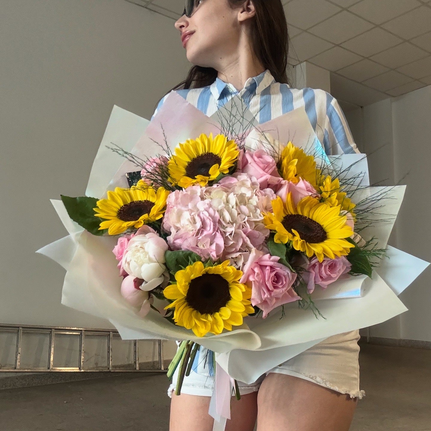 Oferă o surpriză florală deosebită alegând acest buchet cu floarea soarelui, trandafiri si hortensie.