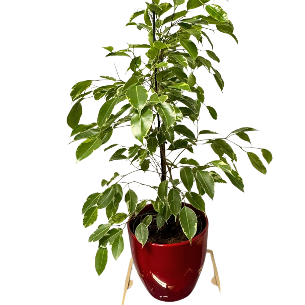 Ficus Benjamina, cunoscut și sub numele de smochin plângător, este una dintre cele mai populare plante de interior datorită aspectului său elegant și ușor curgător. Frunzele sale verzi, lucioase, și forma sa naturală bogată transformă orice spațiu într-un colț verde rafinat. Cu o înălțime de 90–100 cm și livrat într-un ghiveci ceramic decorativ, este alegerea perfectă pentru spații generoase – living, birou sau recepție.