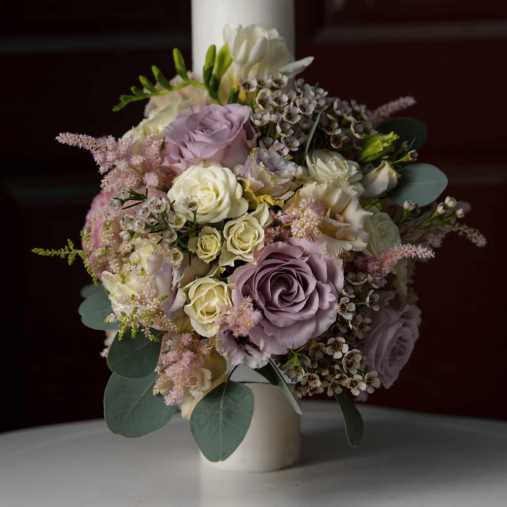 Ce face această lumânare botez fată din flori naturale cu adevărat specială este aranjamentul floral elegant și armonios. Decorată cu flori albe, roz pal și accente de lila, lumânarea aduce un plus de grație și rafinament oricărei ceremonii de botez.